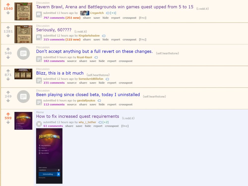 The change in question is to Weekly Quests in Hearthstone. Specifically, the requirements for completing them increased by ~300% (or more!) whereas the reward, e.g. Reward Track XP, only increased by ~20%. The more XP, the more progress you make along the Reward Track, the more freebies and in-game currency you earn to buy more packs, mini-sets, and so on. It’s how to F2P.