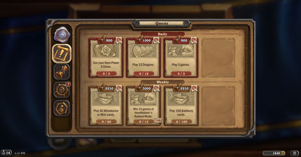 And that’s the rub. How long individual games take will depend on the individual and what decks they use, but I’d say the average for me would be 10 minutes per Ranked game and 20 (or 30+) minutes per Battleground. If we assume you are being matched with people of appropriate skill, you will only be winning 50% of the time. So the one “win 15” quest jumps from 100 minutes to 300 minutes for Ranked, and 200 minutes to 600 minutes in Battlegrounds.