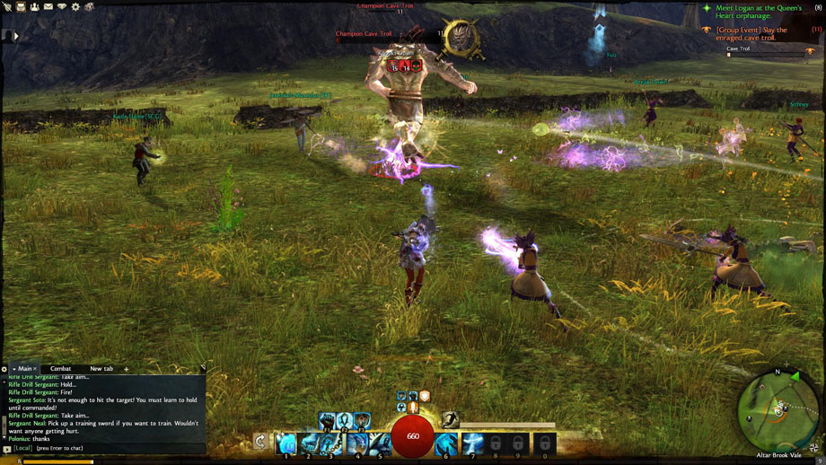 A few months ago, WildStar put out a Dev Diary in which they explained how they took the traditional quest log text and pared it down to a Twitter length of < 140 characters. This was derided at the time by Syp at Biobreak as “dumbing down” quests. Guild Wars 2 beats WildStar to the punch by having no quest text at all. The “dynamism” of GW2 questing is that you never have to talk to NPCs: simply walk in their vicinity, glance at the upper right corner to see what they want you to do, and then do one or all of those tasks. Dynamic Events are the same: get notification, head towards orange circle, do multi-part Public Quest.