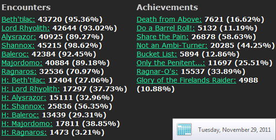 As I did back in June – has it really only been five months? – for posterity’s sake here is a screenshot of WoWProgress’s Firelands numbers as they stood on Tuesday, November 29th, at around 2am:
