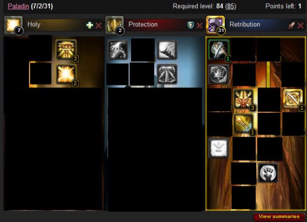 Ret paladins are actually a terrible example to use in the Mists of Pandaria talent scheme, since Blizzard essentially took 9 talents from the Ret tree and are asking Rets to “rebuild” the spec with only half as much as they had before. Hopefully that will change before things go Live, but I’m used to the idea of paladins being nerfed into the ground and/or Ret getting screwed, so whatever.