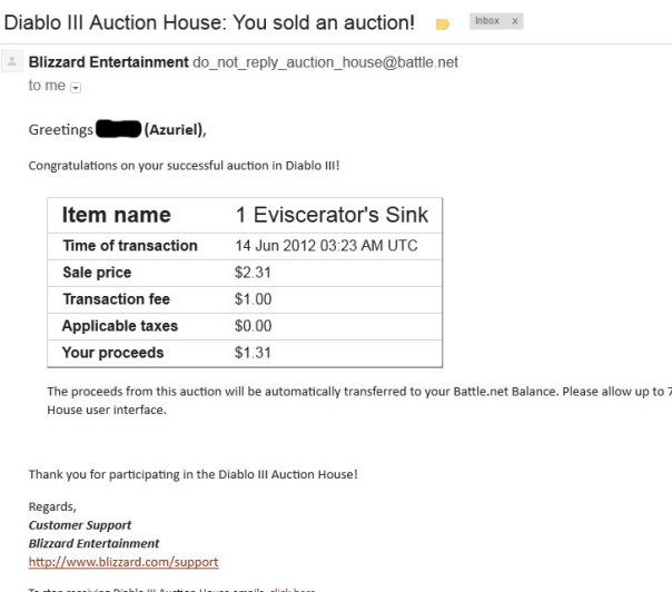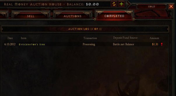 I have no idea what kind of item Eviscerator’s Sink is. My highest-level character is 40, and I technically stopped playing the game a week ago. I vaguely remember the item being in the level ~26 range, which makes the sale all the more bizarre. A quick search of the RMAH shows there are actually quite a few four-digit DPS level 60 items up for $1.25 buyouts (the minimum, netting the seller a whopping $0.25 each). So… was it a misclick? Or did somebody somewhere really want to be awesome for the next two hours?