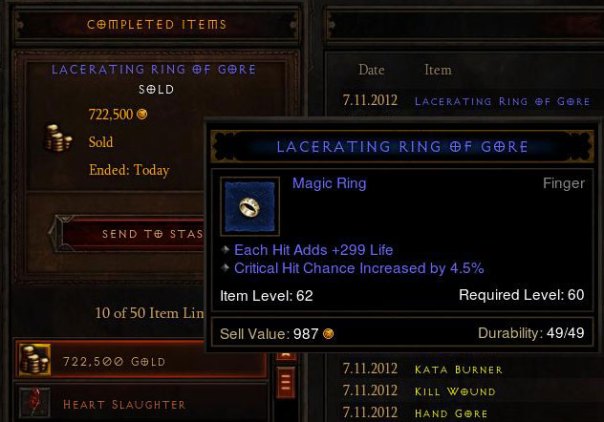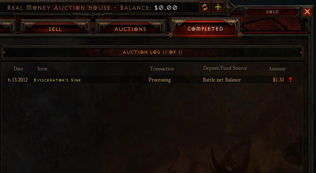 The real-money AH went Live on Tuesday, but it was not until I went to check on my auctions the next day that I realized it. After collecting my meager sales, I decided to see if the RMAH side of things used the same 10-item limit as the Gold AH. As it turns out, you get a full ten more slots to sell things. So, in the interests of clearing out some Stash space, I tossed 10 items up on there. I let the AH set a default bid/buyout price, which simply appears to be adding a decimal to the vendor price, e.g. something that vendors for 231g becomes $2.31.