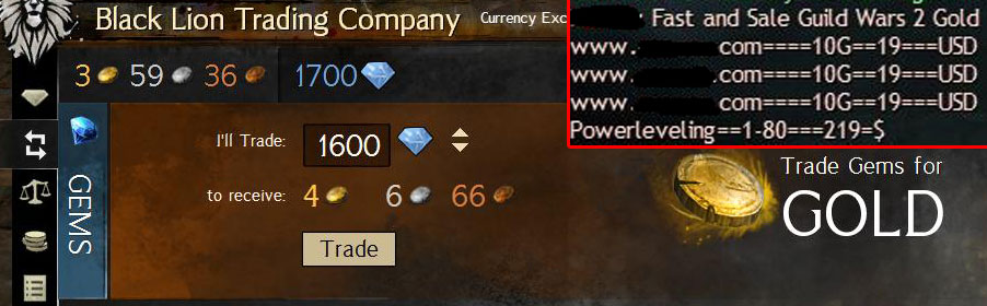 In that screenshot I took over the weekend, 1600 gems would net me an auspicious 4g 6s 66c for basically $20. The gold-seller was advertising in Map chat that $19 buys 10g. Or, 20s 33c vs 52s 63c per $1. That is a 2.5x better exchange rate.