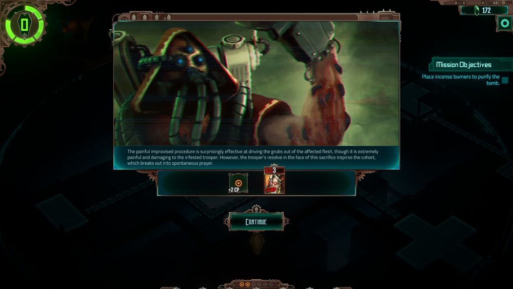 Outside of combat, you are basically playing a Visual Novel with a series of frustratingly Blind Choices. Decide which icon room to enter next, decide which of three choices to pick, and then act surprised when they are terrible outcomes. Within each mission there is an Awakening Meter that increases for each room you enter, increases per turn of combat, and also depending on the Blind Choices you make. As the meter fills, more Necrons join the fight and otherwise things go more badly for you. Once you successfully complete a mission, the Awakening Meter gets added to your overall Awakening Meter (e.g. 3 Awakening = +3%), which leads to a Game Over at 100% if you haven’t unlocked the final boss yet. There are usually a few ways to reduce the Awakening Meter within a mission, but it’s otherwise a race against time and actively discourages you from exploration. Which is necessary, because your units get god-like pretty quickly if left to their own devices.