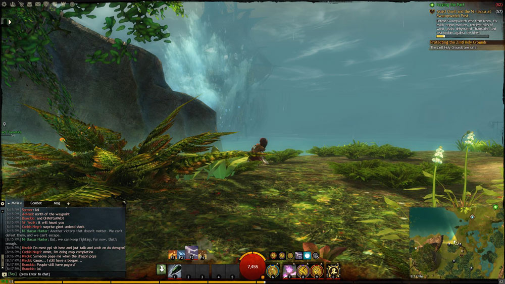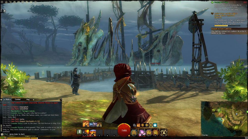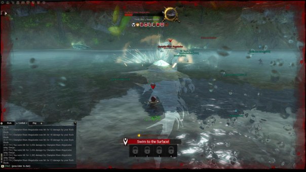 I barely get time to talk to Cuadinti before another survive-the-waves Event starts in the same area. I start to notice Risen frog-people are spawning, and they just sit back dealing 10% of your HP in attacks and stacking poison on you. Since you do not regenerate HP after combat until all debuffs fall off, this poses a particularly strong danger; at one point, I had a poison debuff that would have lasted 35 second. I spec’d my Elementalist as mostly Arcane/Water, so I could cleanse it pretty quickly when I pay attention, but it perhaps might have been an issue for some classes.