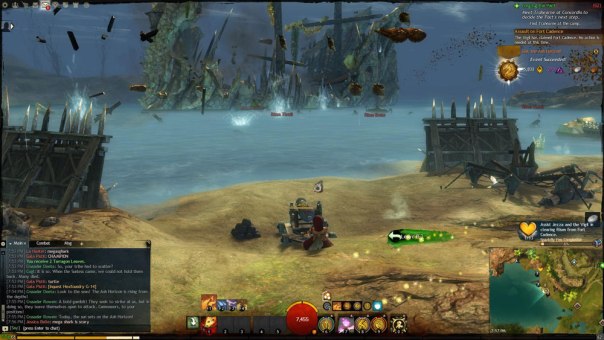 Clearly, someone at ArenaNet reads the blog and is following me around after complaining about the lack of Events. I drop my flamethrower and move to the cannons on the beach. We apparently have 15 minutes to kill the ship before… things happen. As I shoot a cannonball every 5-6 seconds, I see some other players running around near me. It is hard to see what they are doing, although I know the ship is launching things at the beach. None of them ever hit me, so I just keep firing.
