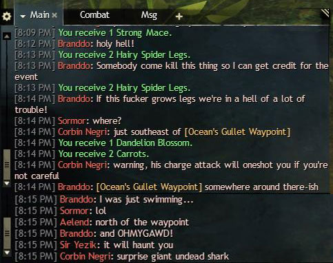 As it turns out… it is fairly ludicrous. Just getting to the surface auto-heals you for an amount that is akin to 2-3 people rezzing you, making things fairly trivial. I could probably still auto-die after getting downed multiple times, but there were several other people around to act as additional targets so it was fine. The shark eventually died, and I got a grey vendor-trash fin, plus whatever the Event normally gives.