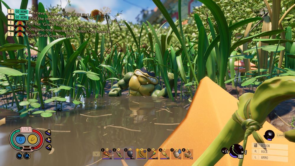 The game world continues to be a huge star of the show. Survival games sometimes have to make huge contortions to accommodate varied biomes – lava must coexist with snow and deep oceans and deserts all in the same map – but the way Grounded interweaves its own biomes is a masterclass in design. The backyard is a believable backyard. And yet going from the Grasslands to the canopy of the Hedge is a big transition. Or to the pond. Or in the sandbox, with it’s deadly Sizzle effect when you traverse the dunes without shade. These are different places, with different resources, and different challenges to overcome. And it all feels… coherent. Believable. Or at least, as believable as teenagers crafting crossbows out of grass vines and crow feathers can be.