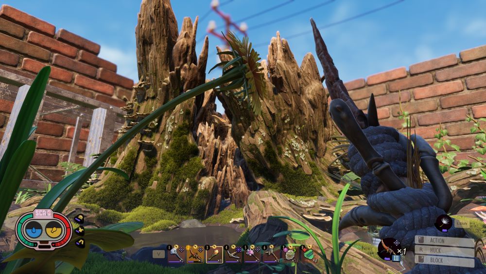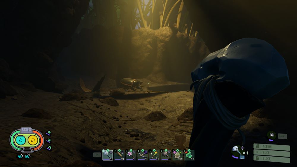 And this is where things go a little off the rails for me. Grounded has all the trappings of survival games, including a huge map where you can build bases just about anywhere, resources needing to be gathered, and so on. But what you are actually doing to progress at all is a series of escalating Souls-like melee encounters. I say “Souls-like” because everything revolves around performing Perfect Blocks against insect attacks, then counter-attacking. You can technically just regular block attacks (with a shield made out of Weevil meat), but you still take a significant amount of damage, can get debuffed, and eventually stunned depending on the frequency of attacks. Meanwhile, you completely block all damage even with a Pebble Axe from any enemy if you Right-Click your mouse at the correct time.