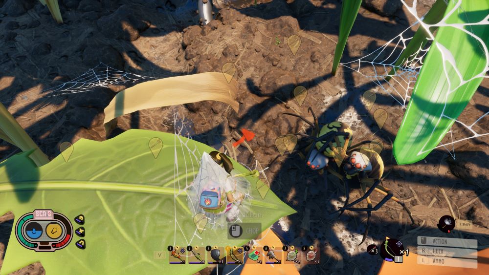 Your first experiences with the yard fauna is usually benign. Aphids, Weevils, and Gnats are basically mobile food and resources. Red Worker Ants are curious about you, but only go hostile when you hit them. Same with the lumbering Lady Bug, although they will quickly one-shot you in the beginning when attacked. Mites are typically your first hostile mob, and they are only really dangerous when you’re distracted or get surrounded. But it doesn’t take a lot of exploring before you encounter the apex predators of the backyard: spiders. Orb Weavers relentlessly patrol their territory and Wolf Spiders are the terror of the night, ranging far and wide through the yard from dusk till dawn. Daylight does not offer much comfort once you journey further afield though, as you encounter Larva, Stinkbugs, Mosquitos, and more.
