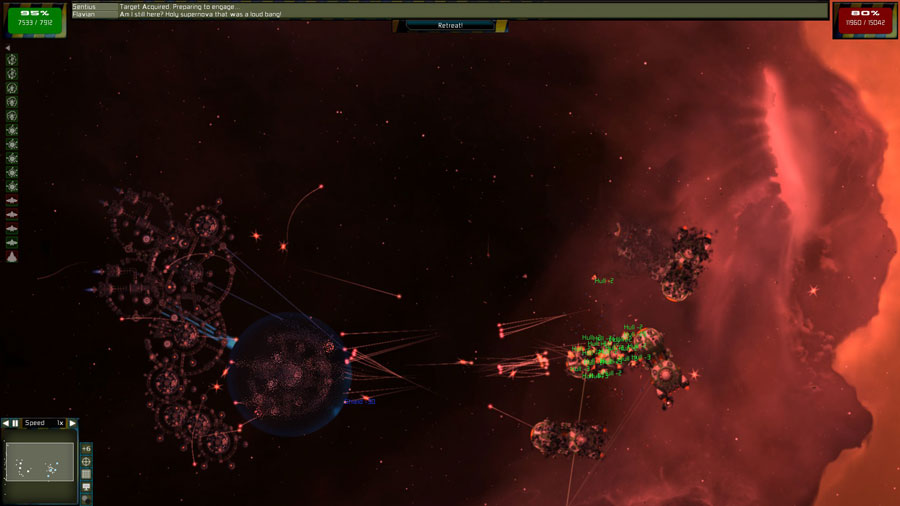 Riding high on my prior victories, I was complacent until a nest of vipers landed in my lap in the form of five Parasite cruisers. It almost didn’t seem fair… for them. I had a slightly bigger fleet than before, after all. As it turns out, the Parasite race has access to an AoE flak cannon that simply shredded my fighters like so much tissue paper. Even with the combined might of my fleet, I was not able to collapse even one shield amongst their ships. Instead of the normal Guidance Scramblers that deflect missiles, they have a version that turns the missile around and causes it to hit you, all with a greater range.