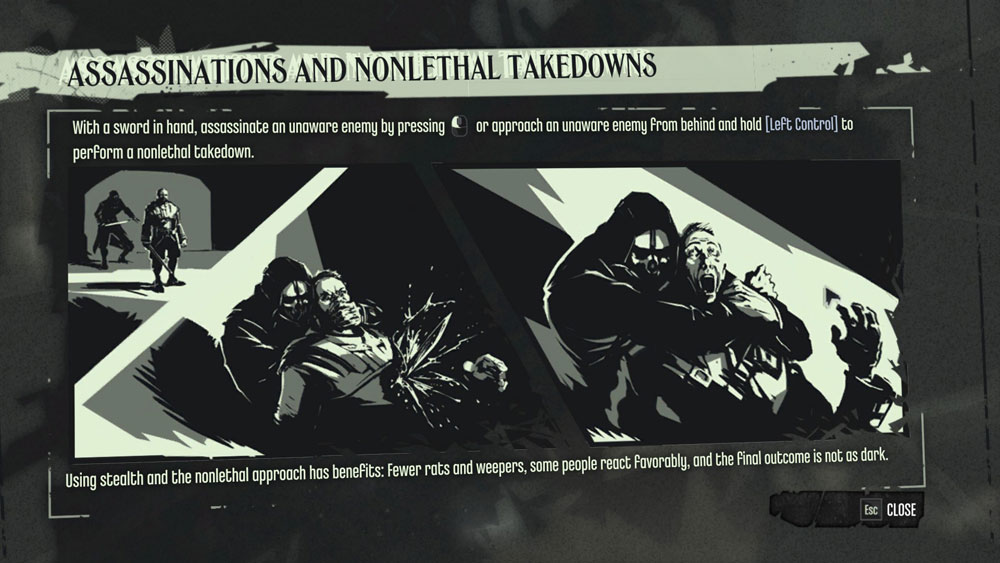 The main problem I have at such an early stage is the notion that we have another seemingly binary Bioshock situation between good/evil. As in, there are apparently two different endings, and if you go only halfway, you might be stuck with the “evil” one. Which is fine… in a game where it feels more like a legitimate choice. Bioshock, for example, just asked you not to kill the Little Sisters; DE:HR had scores of nonlethal maneuvers and/or weapons, and I think the nonlethal option was the default takedown when you pressed the button. Conversely, Dishonored has your sword attack bound to left-click, and you need to hold down the Ctrl button for a few seconds to knock someone out instead.