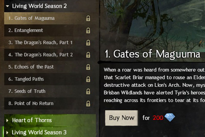 The second is more insidious: ArenaNet’s insane Gotcha! paywalls. The Living Story updates that occur a few times a year are free… if you happen to log into the game and unlock them before the next one comes out.