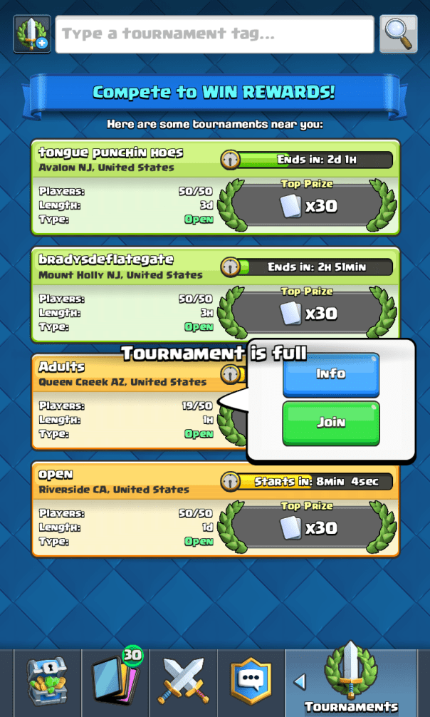 One of the new features in Clash Royale are “Tournaments.” Indeed, Supercell believes Tournaments are so important as to rearrange the entire app UI around to feature them prominently. Which is wierd, consider Tournaments are about the most poorly designed thing I’ve seen in any game.