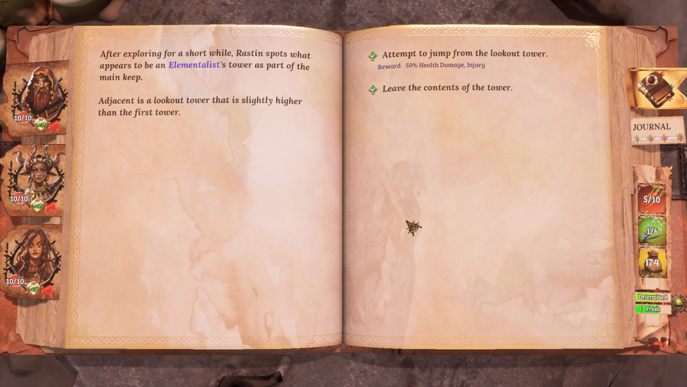 When combat starts, player and enemy tokens alike drop from the sky with a satisfying clink upon a randomize board that rises from the pages of a book. Your characters draw three cards from their deck each turn and can only carry over one between turns. Your deck consists of 9 cards from your class’s default deck, plus any cards that come attached to equipment your party picks up along the way. Sometimes your deck accumulates cards in other ways, such as if your party is Fatigued or Injured (junk cards), or as the result of random encounters. Some cards are free to cast but most require Willpower, which is a temporary resource that dissipates between turns.