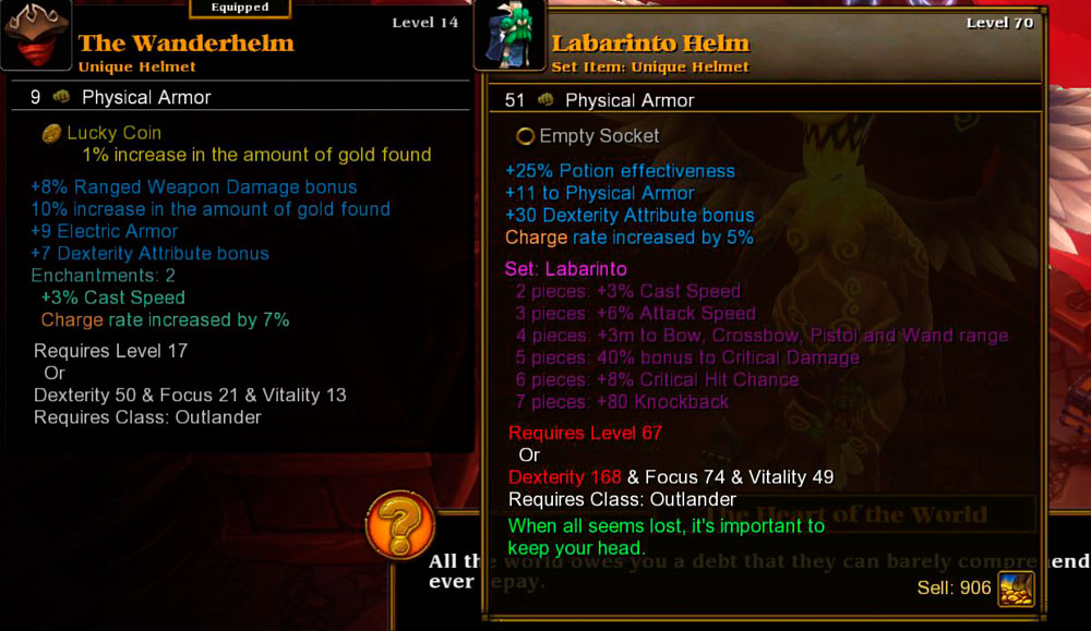 I am spending all this time talking about loot because loot matters in these games. Once you cease expecting any upgrades, the endless, nondescript corridors are filled not with opportunity or excitement, but are instead arteries clogged with the fatty plaque deposits of meaningless mobs. The original Diablo did not have much of a plot beyond “save us from evil” that I can recall, but the setting of gritty evil provided its own sense of gravitas. Conversely, Torchlight does not even bother. “Sidequests” are perversions of the term, and amount to simply killing mobs you were going to kill anyway slogging towards the stairs. Even worse, the “quest rewards” for these things are randomized green items. Look at this shit: