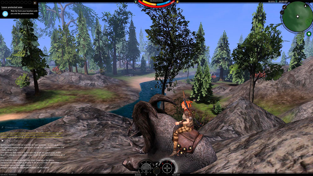 In any event, the next stage of the tutorial was taking a 100kg (!) mount idol from the bank and summoning a mount. From there, you are tasked to running to the border of the protected area, sticking your toe over, and then coming back inside. Ah… so I was paranoid for no reason this entire time. Well, sorta. Apparently if you aren’t careful, people can actually steal your mount and ride away. After which I assume you are shit outta luck. Considering that unsummoning the mount takes a minimum of 2 seconds after dismounting, you’ll never want to actually be in town riding the thing.