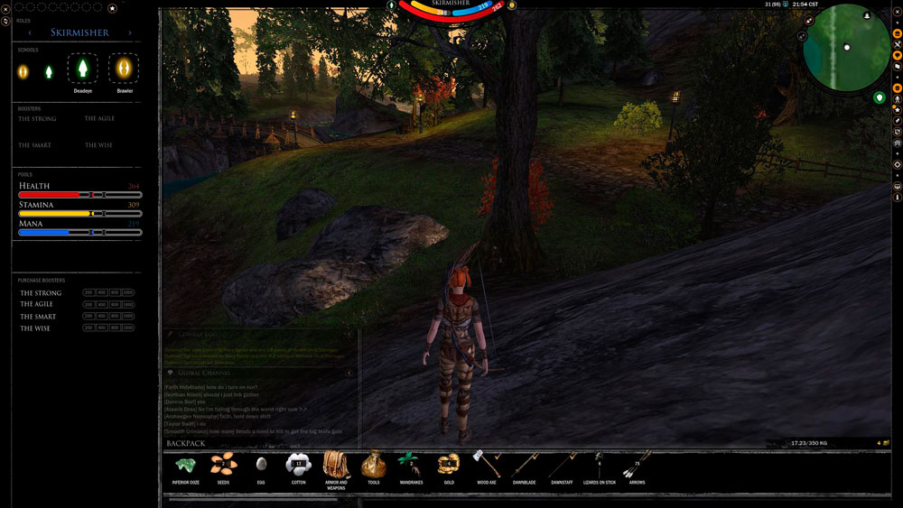 This actually reminds me of another curious thing: AFK-farming seems encouraged in Darkfall. Much like in Guild Wars 2, you must buy a logging axe or herbing sickle in order to gather materials, and these items have charges (durability in this case) that deplete on use. The difference here is that you can start up the animation in Darkfall and walk away from the keyboard – your character will merrily continue chopping timber until (presumably) the axe is worn down to the nub or the tree runs out of wood. It reminds me of what I have heard about mining space rocks in EVE, insofar as gathering only requires button presses once every half-hour. Is that supposed to discourage people from farming, or a concession that farming is so boring the game will do it for you while you Tab out and play something more engaging?