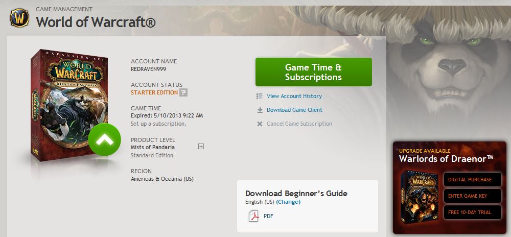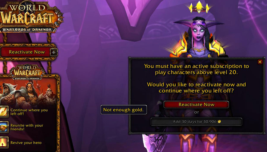 And the story might have begun and ended there. Purchasing game time so I could log in and purchase more game time kinda defeats the purpose of WoW Tokens, yeah? If you’ll notice in the first screenshot though, I was still able to redeem my free 10-day trial of Warlords and take full stock of the situation.