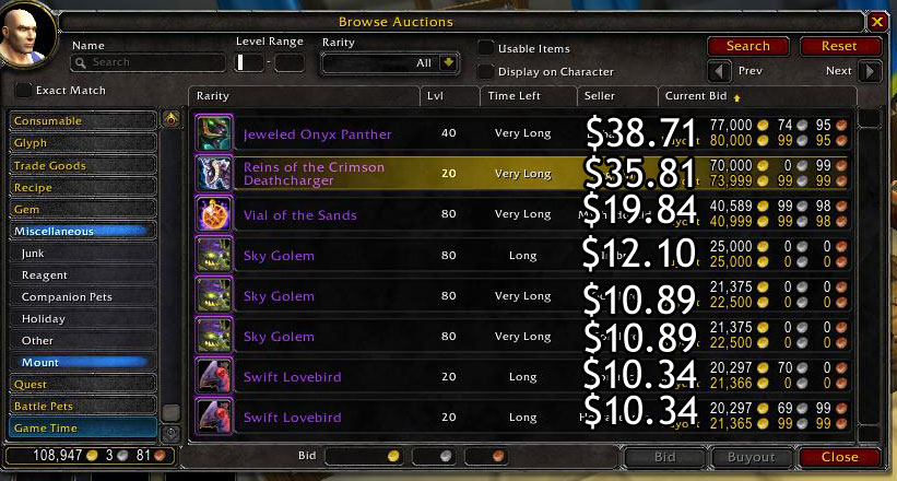 What I knew going into this is that I wanted to jump on the opportunity the WoW Token represents, which is: a gold sink for the AH goblin that has (had) everything. Shit man, back in the day I was experimenting with selling stuff like Vial of the Sands, which was a crafted mount that required an extraordinary sunk gold cost right at the start. If it was not profitable, I would move on with the next bit of expensive AH R&D. It wasn’t millions of gold (Glyph spamming the AH was boring), but I was making gold just to make gold, you know? I couldn’t really bring myself to actually spend it on anything as I knew most things would be irrelevant by the next patch anyway; I wasn’t raiding, so who cares?