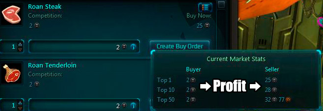 A rather ridiculous non-AMP example I have is with Roan Steaks. I only actually knew about this meat drop because I was trying to figure out if there was any reason to level cooking, and it was one of the requirements in the Tech Tree. At the time, the ~1s buyout price was nothing compared to the money I was making via Challenge decor vendoring, so I put in a 200 item Buy order at like 1.1s. A week later, I noticed that Roan Steaks had a Sell Order of 30s apiece. I sold all of them. To be clear, I turned 2.2g into 57.8g in the equivalent of a penny stock windfall.