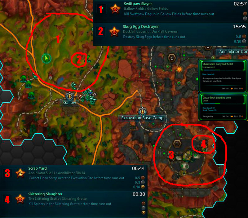 I’m going to be presenting you an Algoroc map to give you a few chances to nab the Chua-Tech Loading Arm (1.31g 79s) and the Shardspire Canyon FABkit (1.23g 74.1s). The following farming route is for Exiles only; I’m going to assume that a similar route exists for Dominion, but I have no such characters. Here it is: