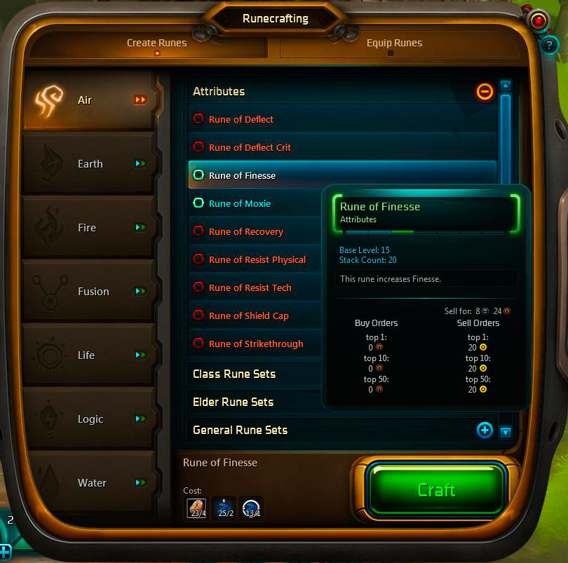 In the above example, Rune of Finesse has a current price of 20g. There aren’t any Buy Orders, so theoretically the demand is questionable. Regardless, four Rune Fragments, two Signs of Air, and one Major Sign of Air costs barely 3g on my server AH. In other words, the potential margins can be HUGE.