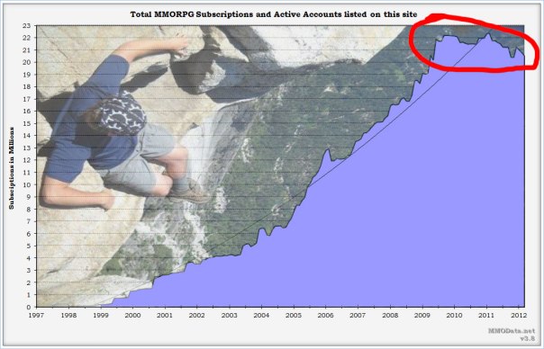 The graph up there is somewhat misleading in two ways. It does not represent the entire MMO market (browser-based games, etc), so it is entirely possible that in the journalistic sense the “MMO” market is doing perfectly fine. But it is misleading in the other direction too: do you really care how Second Life and Dofus and Asian MMOs are doing? There are a lot of games you will never play and/or people you cannot possibly play with that are propping up those numbers. The Truth™ is liable to paint a much bleaker picture.