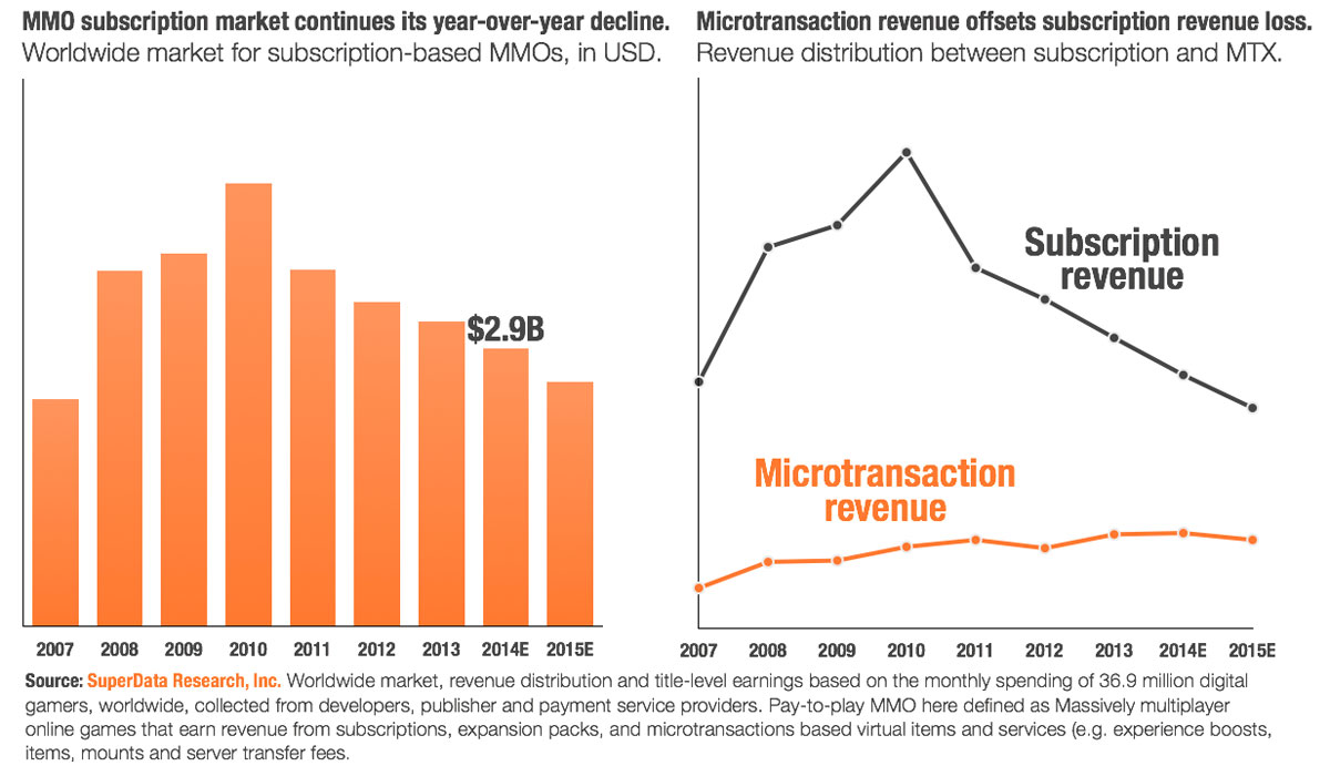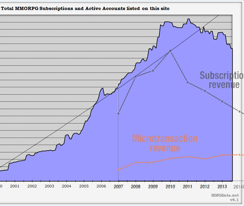 My methodology was to squish the one graph until the years lined up. Regardless, I have a hard time imagining the precipitous drop in subscription revenue on their chart is correlated in reality. There is a very real decline in overall MMO population – we have reached the same population levels from mid-2008 at this point – but revenue can’t be that bad. Can it?