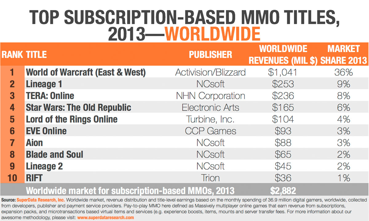 As pointed out in the comments over on TAGN, the accuracy of numbers and legitimacy of the research company itself might be in question. For one thing, neither FFXI nor FFXIV are even on that list. The absence of Guild Wars 2 makes a little sense given the criteria for inclusion (subscription option), but the others? I dunno. Perhaps they are being implied in the missing 26% of market share. Which, incidentally, covers $756 million of the total revenue on the chart.