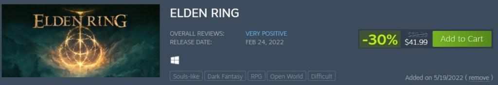 Of course, the best part of seasonal Steam sales these days is that it leads to 3rd party storefronts offering even steeper discounts. For example, I won’t be purchasing Elden Ring on Steam for $41.99, I will be purchasing it from DLGamer for $36.99. Using 3rd-parties has bit me in the past, but “Steam Activation” are the magic words. Well, provided there aren’t delays in getting the keys. The only real downside is losing the ability to refund the game within the 2-hour window, but I’m thinking that won’t be relevant here. Probably.