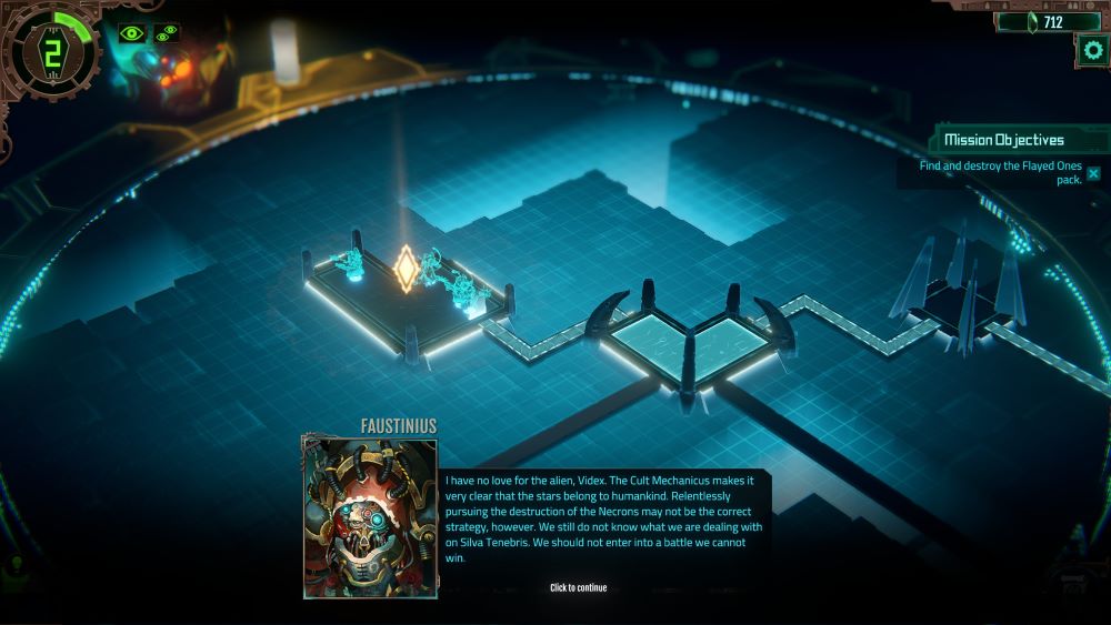 There are technically other tactical considerations. Ranged weapons cannot be used when in melee range, and there is an Attack of Opportunity when you move out of a threatened square. Units can block each others’ Line of Sight. Necron units will come back to life after a few turns unless you spend time attacking their downed forms. There is an Armor system of sorts that reduces the damage from either Physical or Energy attacks by a flat amount. Necron unit HP/Armor is unknown unless they are scanned by Servo-Skulls or attacked with specific weapons that indicate that said info is captured. Spending time to Scan computer consoles will award you more “Blackstone,” which is an upgrade currency for your Tech-Priests.