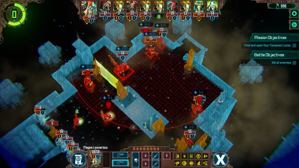 But honestly? Heading into the mid-game none of that really matters. Once you have figured out a combination of abilities to keep your team loaded with Cog, you can just blast every enemy out of existence with relative impunity. Indeed, it gets amusing once a character or two unlocks the “Immune to Attacks of Opportunity” skill, as it allows you to freely traverse the map. See, your units can move X spaces normally, but they can spend 1 Cog to extend that range another X spaces. And another, and another, as long as you have Cog to spare. Which means one Tech-Priest can run around the map collecting all the Cog from structures as he goes, scanning all the consoles, and then end up where he started with a full Cog gauge, depending on abilities.