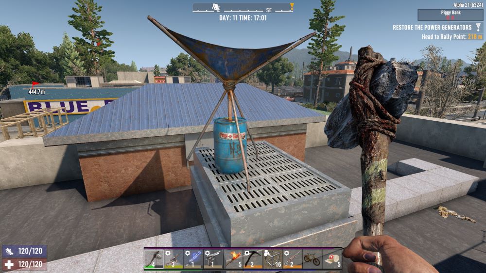 Things were dicey there for a bit. As mentioned, I had a wooden house on stilts on top of a gas station. While I survived the 7th day zombie horde with ease – whose zombies automatically see you through walls – there was a night where some zombies made it to the roof and were mucking about, seemingly ineffectively.