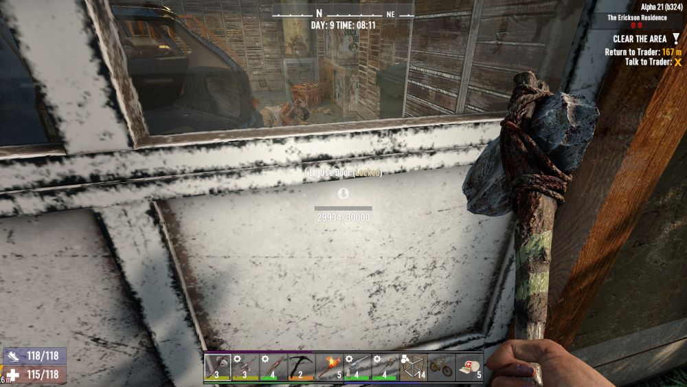 All of the changes mentioned above though make digging immaterial to begin with. There used to be a tension between looting buildings and still saving enough time to build your own base to survive horde night. Now the optimal, dev-directed course is to spam quests from vendors – oh yeah, quests were introduced a few Alphas ago – to get PoI loot + quest loot, and just camp on the roof of a bank or whatever for the hordes. The zombies will eventually tear down the building after a few weeks of hordes, but by that time you will have enough high-level loot to kill them with ease, especially after creating a little obstacle course.